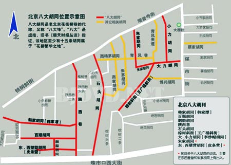 北京的胡同多如牛毛,獨(dú)獨(dú)八大胡同聞名中外。因?yàn)楫?dāng)年,這里曾是煙葉花柳巷的代名詞。 “八大胡同”在西珠市口大街以北、鐵樹斜街以南,由西往東依次為:百順胡同、胭脂胡同、韓家潭、陜西巷、石頭胡同、王廣福斜街、朱家胡同、李紗帽胡同。