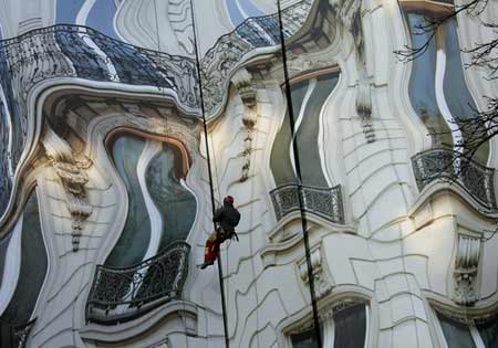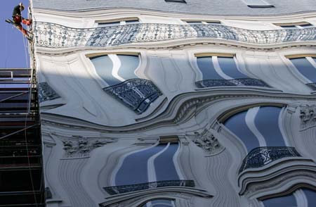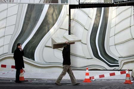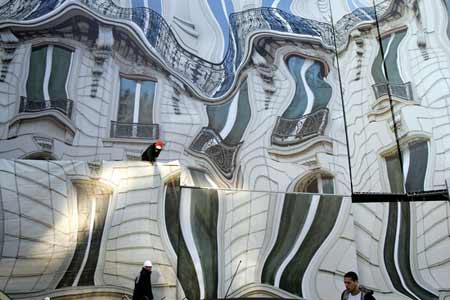 2006年12月20日,巴黎,一幢大樓外墻面重新裝修,工人用“新奇”擋板作護(hù)欄,由藝術(shù)家Pierre Lavie設(shè)計(jì)的扭曲墻體。