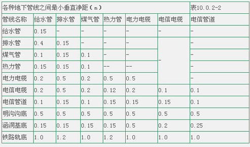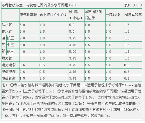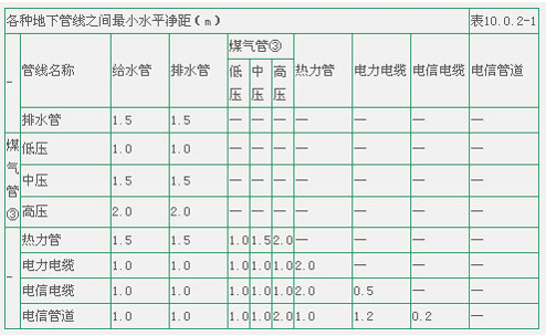 注: ①表中給水管與排水管之間的凈距適用于管徑小于或等于200mm,當管徑大于200mm時應(yīng)大于或等于3.0m; ②大于或等于10kv的電力電纜與其它任何電力電纜之間應(yīng)大于或等于0.25m,如加套管,凈距可減至0.1m;小于10kv電力電纜之間應(yīng)大于或等于0.1m; ③低壓煤氣管的壓力為小于或等于0.005MPa,中壓為0.005~0.3MPa,高壓為0.3~0.8MPa.