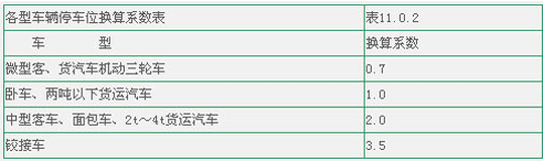 7) 停車場車位數(shù)的確定:本規(guī)范表6.0.5中機動車停車位控制指標,是以小型汽車為標準當量表示,其它各型車輛的停車位,應(yīng)按表11.0.2中相應(yīng)的換算系數(shù)折算。