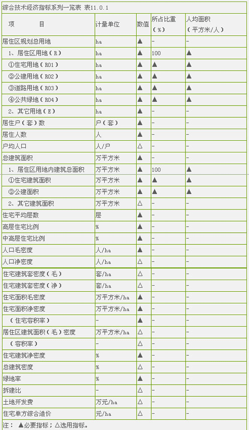 1、居住區(qū)綜合技術(shù)經(jīng)濟指標的項目應(yīng)包括必要指標和可選用指標兩類,其項目及計量單位應(yīng)符合表11.0.1規(guī)定。