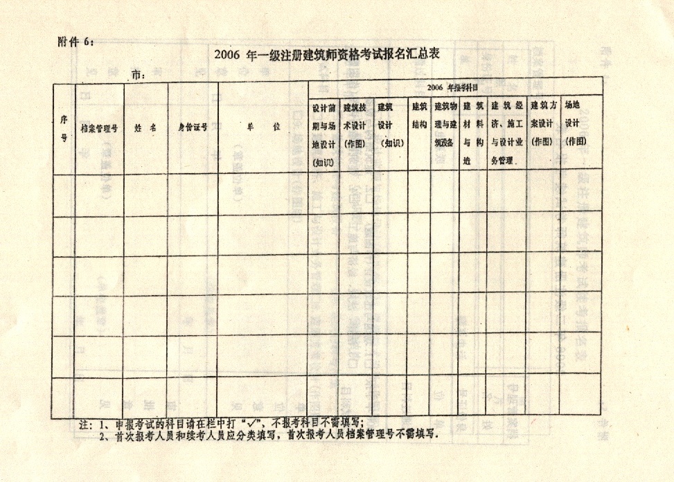 一、2006 年度注冊建筑師資格考試報名工作由省注冊建筑師管理委員會辦公室負(fù)責(zé)(辦公室設(shè)在省建設(shè)廳執(zhí)業(yè)資格注冊中心)。各市建設(shè)局、華北石油管理局協(xié)助省注冊建筑師管理委員會辦公室匯總本區(qū)域(或本系統(tǒng))考生名單,為便于管理,請各市建設(shè)局、華北石油管理局將報考人員名單按附件6所提供的格式匯總形成EXCEL表格進(jìn)行上報。有關(guān)材料于2006年3月15日前報省注冊建筑師管理委員會辦公室。