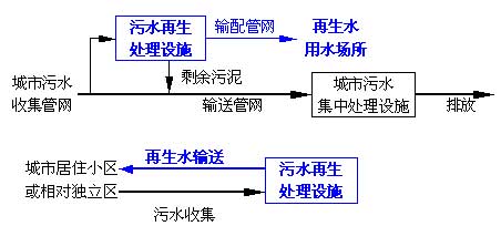 城市污水再生利用系統(tǒng):集中型、就地(小區(qū))型和建筑中水系統(tǒng)簡示如下: