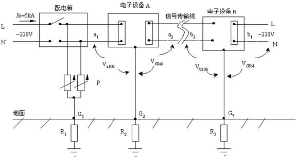 2.1 圖3是建筑物受直擊雷后室內(nèi)設(shè)備受損壞的示意圖,圖中A、B、C是處在不同樓層的電子設(shè)備;SA、SB、SC為各設(shè)備之間互相通信的信號線;S是與建筑物外的設(shè)備通信信號線;G1、G2、G3為不同樓層建筑物內(nèi)部鋼筋引下線;L、LA、LB、LC為設(shè)備供電線路;RS為設(shè)備工作接地,RG為建筑物防雷接地,GA、GB、GC為設(shè)備工作接地在主桿線上的接地點;PL、PS分別為電源避雷器和信號避雷器。