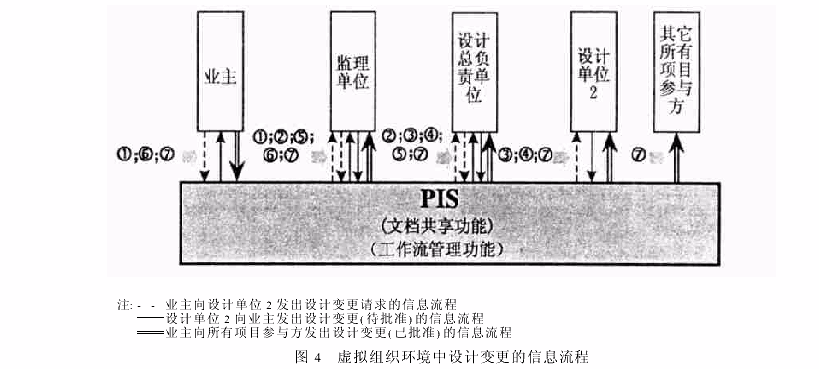下面還是以圖1所描述的設(shè)計變更事件為例,說明虛擬組織環(huán)境的橫向信息溝通方式,其相應(yīng)的信息流程變?yōu)閳D4.圖中,1業(yè)主提出設(shè)計變更請求,將該文檔信息上傳至PIS,PIS自動將其發(fā)送給監(jiān)理單位;2監(jiān)理單位審核設(shè)計變更請求,通過PIS自動發(fā)送給設(shè)計總負責單位;3設(shè)計總負責單位審核設(shè)計變更請求,通過PIS自動發(fā)送給設(shè)計單位2;4設(shè)計單位2討論設(shè)計變更請求(假設(shè)同意),作出設(shè)計變更(可下載也可在線修改),通過PIS自動發(fā)送給設(shè)計總負責單位;5設(shè)計總負責單位審核設(shè)計變更,通過PIS自動發(fā)送給監(jiān)理單位;6監(jiān)理單位審核設(shè)計變更,通過PIS自動發(fā)送給業(yè)主;7業(yè)主批準設(shè)計變更,通過PIS將其自動發(fā)送給所有項目參與方。需要說明,以上某些文檔信息的審核或批準可以采用數(shù)字簽名等認證技術(shù)。
