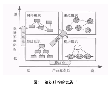 自從20世紀(jì)初泰勒的科學(xué)管理理論建立以來,傳統(tǒng)的強(qiáng)調(diào)分工和集權(quán)的組織理論也隨之形成。但是最近幾十年來對于許多組織而言,市場和競爭狀況發(fā)生了巨大的變化,過去的靜態(tài)環(huán)境已經(jīng)不復(fù)存在。因此,傳統(tǒng)的層級組織必須相應(yīng)地進(jìn)行變革,以滿足動態(tài)環(huán)境的需求。組織的變革主要包括模塊化、網(wǎng)絡(luò)化以及虛擬化等三個基本策略,它們分別適用于不同的前提條件,如圖1所示。