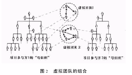。7)虛擬團(tuán)隊(duì)的組合:虛擬團(tuán)隊(duì)的成員是來自于各個項(xiàng)目參與方的“母組織”。虛擬團(tuán)隊(duì)的成員組合不是基于“母組織”的結(jié)構(gòu),而是基于所處理任務(wù)所需要的能力。根據(jù)任務(wù)處理的需求,合適的人員將從“母組織”中脫離,并組合為動態(tài)的時間上有限的虛擬團(tuán)隊(duì)。在成功完成其任務(wù)之后,虛擬團(tuán)隊(duì)解散,團(tuán)隊(duì)成員重新返回到原來的“母組織”。圖2說明了虛擬團(tuán)隊(duì)的組合。需要說明,這里的虛擬團(tuán)隊(duì)1和虛擬團(tuán)隊(duì)2可以從事同一個項(xiàng)目,也可以是不同的項(xiàng)目。也就是說,一個項(xiàng)目參與方可以同時參與多個項(xiàng)目,可以是多個虛擬組織的參與方。