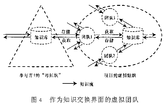 。2)組織學(xué)習(xí)和知識庫:在項(xiàng)目虛擬組織的構(gòu)成過程中,來自不同項(xiàng)目參與方“母組織”的虛擬團(tuán)隊(duì)為整個虛擬組織帶來了不同的互補(bǔ)的知識。虛擬團(tuán)隊(duì)在項(xiàng)目建設(shè)的協(xié)作過程中,不斷使用這些知識,并且不斷產(chǎn)生新的知識。在虛擬組織完成項(xiàng)目任務(wù)而解散之后,所有這些新的知識和經(jīng)驗(yàn)將最終返回到各個項(xiàng)目參與方的“母組織”。知識通過虛擬團(tuán)隊(duì)始終在各個項(xiàng)目參與方“母組織”的內(nèi)部知識庫和虛擬組織的共享知識庫之間不斷循環(huán)。