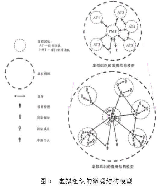 根據(jù)以上對虛擬團(tuán)隊(duì)的分析,下面的圖3給出了虛擬組織的宏觀結(jié)構(gòu)模型和微觀結(jié)構(gòu)模型。在虛擬組織的宏觀結(jié)構(gòu)模型中,該虛擬組織由一個項(xiàng)目管理團(tuán)隊(duì)、多個任務(wù)團(tuán)隊(duì)與多個單獨(dú)個人組成(比如說是咨詢專家),在他們之間存在著團(tuán)隊(duì)之間的交互。然后把虛擬組織宏觀結(jié)構(gòu)模型中的虛擬團(tuán)隊(duì)細(xì)化,可以得到虛擬組織的微觀結(jié)構(gòu)模型。其中,每個團(tuán)隊(duì)都由領(lǐng)導(dǎo)(項(xiàng)目經(jīng)理或團(tuán)隊(duì)領(lǐng)導(dǎo))和團(tuán)隊(duì)成員組成。除了在虛擬組織的宏觀結(jié)構(gòu)模型中已經(jīng)表達(dá)的團(tuán)隊(duì)之間的交互之外,還可以看到團(tuán)隊(duì)內(nèi)部的交互。由于項(xiàng)目經(jīng)理和團(tuán)隊(duì)領(lǐng)導(dǎo)分別是整個虛擬組織和虛擬團(tuán)隊(duì)中的主要協(xié)調(diào)者,因此其溝通渠道比較集中。另外,圖中虛擬團(tuán)隊(duì)和虛擬組織的邊界都用了虛線,用以說明其邊界的模糊性和其構(gòu)成的動態(tài)性。