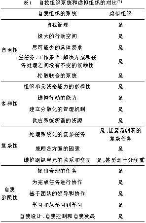 同樣的,如果一個組織對外界封閉,則必然會導(dǎo)致活力的喪失,因而幾乎所有新的組織理論都把企業(yè)描述為一個開放系統(tǒng)。事實(shí)上,自我組織在組織理論中并不是一個完全新的概念,諸如自主的工作團(tuán)隊(duì)、靈活的工作時間、分散化和代理、以及協(xié)作式的領(lǐng)導(dǎo)等等都隱含了自我組織的思想。自我組織的組織系統(tǒng)通常具備高度的靈活性、創(chuàng)造性并且能夠在極大程度地激發(fā)組織成員的潛力。按照系統(tǒng)論的觀點(diǎn),具備高度開放性和動態(tài)性等特征的虛擬組織是典型的自我組織的組織系統(tǒng)。虛擬組織完全符合自我組織系統(tǒng)的四個基本特征,即自治性、多樣性、復(fù)雜性和自我參照性,如表1所示。虛擬組織中的大多數(shù)組織關(guān)系其實(shí)就是自我組織過程的結(jié)果,這種自發(fā)的過程很少需要由領(lǐng)導(dǎo)人員去進(jìn)行有意識的規(guī)劃和控制,自我組織的組織機(jī)制保證了虛擬組織的強(qiáng)大生命力。