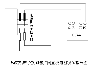 針對(duì)用常規(guī)方法處理仍然不能解決勵(lì)磁機(jī)電刷火花的問(wèn)題,后來(lái)停機(jī)時(shí),用QJ44型雙臂電橋測(cè)量勵(lì)磁機(jī)轉(zhuǎn)子換向器各相鄰兩片之間的直流電阻值,如圖所示。要注意的是絕不允許在雙臂電橋處,用導(dǎo)線將C、P端連接改用兩根測(cè)試線測(cè)量,否則不能消除表筆與換向片間的接觸電阻對(duì)測(cè)量結(jié)果造成的影響。