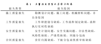 。1)從公司層面建立質(zhì)量損失類型與原因分析表,如表 1 所示。質(zhì)量損失類型與原因分析表綱要性強(qiáng),是系統(tǒng)方面全面的統(tǒng)籌;是從公司層面對質(zhì)量損失類型及其原因的概要性羅列。質(zhì)量損失類型主要包括施工質(zhì)量損失、安全質(zhì)量損失、合同質(zhì)量損失及工作質(zhì)量損失。損失原因只列出總體框架,在此基礎(chǔ)上應(yīng)作進(jìn)一步的細(xì)分以便將損失源落實(shí)到具體部門或個(gè)人。