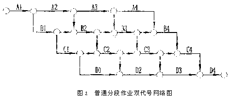 根據(jù)“表2”的虛箭線判定結(jié)果,可快捷而準(zhǔn)確地繪制出普通分段作業(yè)的雙代號網(wǎng)絡(luò)圖,見圖2.