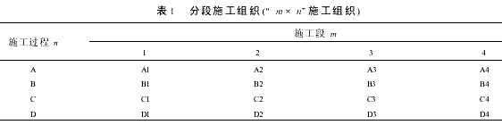 表1所示施工組織表示整個工程分為四個施工段(m=4),每一施工段都有A、B、C、D四個施工過程(n=4)。