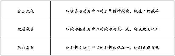 從以上分析可以得出兩個(gè)結(jié)論:第一,企業(yè)思想政治工作與企業(yè)文化一樣,也屬于企業(yè)管理的軟件,也超越了一般管理的層次,它也是一種有自己的價(jià)值觀念,有自己理想信念的文化建設(shè)。第二,企業(yè)思想政治工作不是一種單一物質(zhì)的文化建設(shè),而是包括了兩種不同性質(zhì)的文化建設(shè)。
