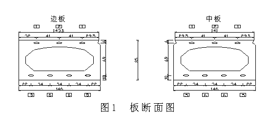 大橋橋板設(shè)計(jì)板壁很薄,底板厚為20cm,側(cè)壁14cm,且底、頂板都要施加預(yù)應(yīng)力,故無法像普通板那樣布設(shè)集束鋼絞線,而只能在預(yù)制過程中預(yù)埋波紋管,布設(shè)位于同一平面上的扁平鋼絞線,見圖1.