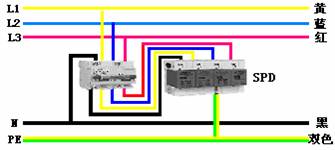 根據(jù)《建筑物防雷設(shè)計(jì)規(guī)范》GB50057-94(2000年版)及《建筑物電子信息系統(tǒng)防雷技術(shù)規(guī)范》GB50343-2004防雷規(guī)范要求,配電系統(tǒng)應(yīng)采用三級(jí)分流,本工程考慮在總配電箱(大樓北面)安裝一級(jí)電源浪涌保護(hù)器,以達(dá)到初步瀉流目的,在四樓分配電進(jìn)線處安裝二級(jí)電源浪涌保護(hù)器,三級(jí)采用精細(xì)保護(hù)的浪涌保護(hù)器若干,一、二級(jí)浪涌保護(hù)器安裝方法如下圖。