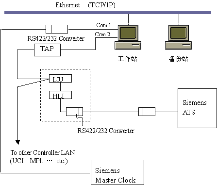 由圖2可見,OCC中央級除負責接收通信系統(tǒng)時間同步信號外,在OCC局域網(wǎng)中還連接有與ATS數(shù)據(jù)接口HLI以及模擬屏設備,并通過中央工作站(PC機)將數(shù)據(jù)傳輸?shù)紹AS以太網(wǎng)上,同其它車站級BAS系統(tǒng)進行數(shù)據(jù)交換。需要指出的是:正常情況下,所有隧道通風模式由連接在中央級局域網(wǎng)上的BAS控制器根據(jù)ATS列車阻塞信號或人工指令,進行計算確定,并通過以太網(wǎng)下發(fā)環(huán)控模式指令號到相關(guān)車站,再由相關(guān)車站BAS控制器指揮相關(guān)設備正確動作。當該工作站死機或故障時,則模式無法正確下達,只能由相關(guān)車站通過就地模擬屏超弛控制,影響了事故情況下的反映速度。由于隧道通風涉及乘客人身安全,對隧道通風模式正確及時執(zhí)行有很高的要求,因此BAS系統(tǒng)中央級局域網(wǎng)應通過專門網(wǎng)關(guān)(交換機)或服務器連接以太網(wǎng)。