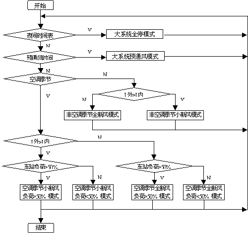 大系統(tǒng)正常工藝模式的自動判定執(zhí)行主要依據(jù)如下條件:①依據(jù)室外溫度判定大系統(tǒng)執(zhí)行空調(diào)或非空調(diào)季節(jié)模式②依據(jù)車站內(nèi)外空氣焓值的比較判定全新風或小新風模式 ③依據(jù)車站負荷情況判定執(zhí)行負荷大于50%模式或小于50%模式 4)依據(jù)時間判定夜間或白天模式。圖4為正常運行自動模式判斷執(zhí)行流程。