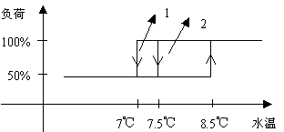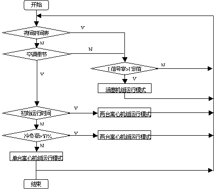 (3) 根據(jù)環(huán)控要求,車站負荷判定采用水系統(tǒng)分水器溫度(冷凍水出水溫度)判定,當分水器溫度高過某定值開啟兩臺離心機組,低過該值時則僅開一臺離心機組,該值采用死區(qū)控制,廣州地鐵一號線初定為7℃~9 ℃。