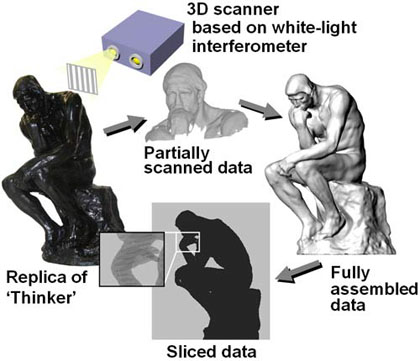 通過這種新方法,科學家對羅丹的不朽杰作《思想者》的復制品進行了掃描,制作出比大約6英尺高的原創(chuàng)作品小9300倍的微型作品。楊東勇及同事將這一發(fā)現(xiàn)發(fā)表在1月4日出版的國際物理學權威雜志《應用物理學文獻》上。