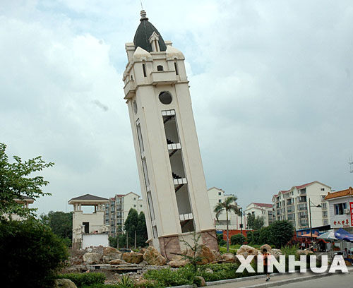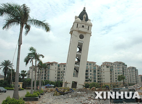 近日,廣西柳州金河灣住宅小區(qū)對小區(qū)內(nèi)一座20多米高的鐘樓進(jìn)行爆破拆除,不料爆破沒有取得成功,鐘樓只是向東南方向傾斜了約30度,儼然成了一座“比薩斜塔”。目前,該市有關(guān)部門已督促小區(qū)采取安全措施,以防發(fā)生危險。 新華社發(fā)(子武 攝)