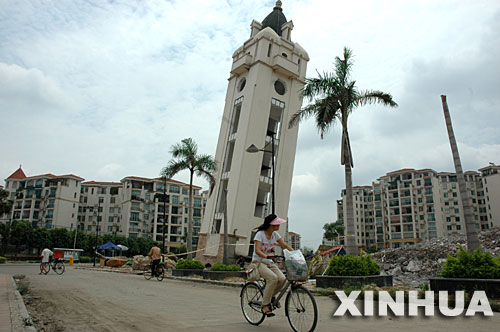6月27日,一名青年騎自行車從廣西柳州市金河灣住宅小區(qū)傾斜的鐘樓旁經(jīng)過。