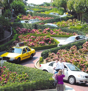 由于花街陡峻而彎曲,舊金山市還就車輛行駛做出特殊規(guī)定,規(guī)定行使車輛必須繞著花壇盤旋行進(jìn),不得對(duì)花壇造成任何損壞;車速必須減至5英里以下,否則會(huì)受到相應(yīng)處罰。不過到這里誰又想開快?好不容易排隊(duì)等到了,又是東張西望美景難收,巴不得賴著不動(dòng)呢!不過,手癢的駕駛員也別傷心,以花街為背景的電子游戲多著呢,飛車族盡可在虛幻世界里一展身手。