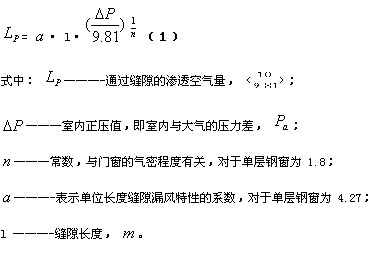 系統(tǒng)開始運(yùn)轉(zhuǎn)后,由于新風(fēng)Lw的吸入,室內(nèi)空氣壓力增加,當(dāng)增加的△P足以通過窗縫、門縫滲透到室外的空氣量Lp=Lw時(shí),系統(tǒng)的運(yùn)轉(zhuǎn)達(dá)到了空氣的平衡,此時(shí)的△P為室內(nèi)的正壓值,一般設(shè)計(jì)采用△P=5~10Pa,按作用壓差法室內(nèi)的滲透空氣量可用下式計(jì)算