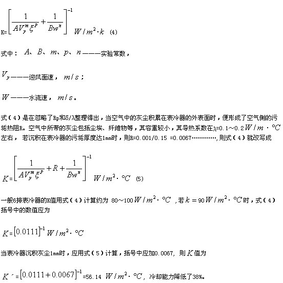 若對(duì)冷卻塔的循環(huán)水不進(jìn)行處理,則水側(cè)污垢熱阻最小值(不計(jì)水中鈣鎂離子濃縮后的沉淀)也要達(dá)到Rf =0.0005m2·k/w, 將式中的Rf=0.00018改成Rf=0.0005,其他數(shù)值不變,則其計(jì)算結(jié)果為k=3180.0005m2·k/w,傳熱能力下降了46% .