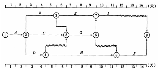 D、波形線表示工作與其緊后工作之間的時(shí)間間隔