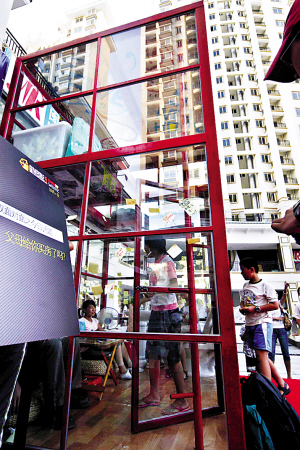 今年7月,呂國華在當(dāng)?shù)匾痪W(wǎng)絡(luò)社區(qū)發(fā)帖提出建樓中樓的設(shè)想。當(dāng)?shù)匾患屹徫镏行牡弥藚螄A的這個創(chuàng)意,免費為他提供了一塊小空地。呂國華的房子是鋼架結(jié)構(gòu)的,長2.5米、寬2米、挑高3.6米,墻是用鋼化玻璃打造而成。房子里用鋼板隔成“樓中樓”,一根3.6米的鋼管成了呂國華上下樓的“樓梯”。樓上的空間用來當(dāng)臥室,用一張長2米、寬1.5米的草席當(dāng)床,床的后面用幾個儲物箱搭成簡易的衣柜,儲物箱的面板就是他的電腦桌。樓下的空間設(shè)計成客廳、廚房、衛(wèi)生間。衛(wèi)生間只留了一個馬桶和洗手池的位置。呂國華說,從9月30日晚入住到現(xiàn)在,他的家接待了上萬人參觀。他自稱為“MR.5”—5平方米先生,展示只有5平方米的壓縮生活。