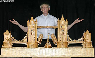 國際在線專稿:現(xiàn)年41歲的邁克爾·威廉姆斯是一名來自英國艾塞克斯郡的一名養(yǎng)路工,但他對另外一件事情更有興趣——用火柴棍建造模型。威廉姆斯花費十年時間設計并建造了倫敦著名的標志性建筑——泰晤士河上邊上的倫敦塔橋,為此他用了160多萬根火柴棍。
