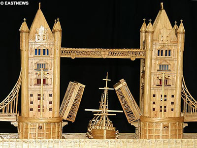 這件復制品用兩個家用普通燈泡照亮兩座塔,兩座塔之間有一艘“大型帆船”,由一個永久性發(fā)光二極管燈泡照亮,能夠維持10萬個小時的照明。盡管這個模型只是真實塔橋的微縮版,但它卻花費了160多萬根火柴棍和10年的建造時間。