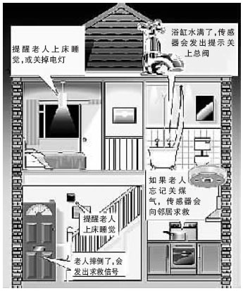 比如,老人打開了浴缸的水龍頭準(zhǔn)備洗澡,水一旦溢出浴缸,傳感器就會發(fā)出警報(bào)。那聲音就像是個(gè)10多歲的孩子在提醒:“爸爸,別忘了你在洗澡。”如果老人仍不關(guān)上龍頭,那警告信號會傳送到水管總閥處的電腦芯片上,自動(dòng)把水關(guān)上。夜深了,如果老人要是突然心血來潮要出去走走,那傳感器就會提醒:“現(xiàn)在還是夜里呢,回去睡覺吧!比绻先嗽陂T廳跌倒并昏迷了,那傳感器就會向鄰居發(fā)出求救聲:“快幫幫我爸爸,他摔倒了!