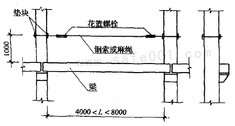 梁面上需行走時(shí),其一側(cè)的臨時(shí)護(hù)欄橫桿可采用鋼索,當(dāng)改用扶手繩時(shí),繩的自然下垂度不應(yīng)大于l/20,并應(yīng)控制在10cm以內(nèi),見附錄四附圖4.4.l為繩的長(zhǎng)度。