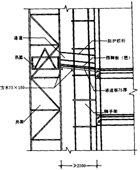 四、 井架與施工用電梯和腳手架等與建筑物通道的兩側(cè)邊,必須設(shè)防護(hù)欄桿。地面通道上部應(yīng)裝設(shè)安全防護(hù)棚。雙籠井架通道中間,應(yīng)予分隔封閉。