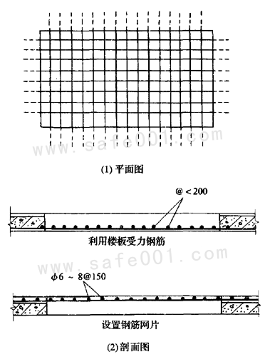 三、 邊長(zhǎng)為50~150cm的洞口,必須設(shè)置以扣件扣接鋼管而成的網(wǎng)格,并在其上滿鋪竹笆或腳手板。也可采用貫穿于混凝土板內(nèi)的鋼筋構(gòu)成防護(hù)網(wǎng),鋼筋網(wǎng)格間距不得大于20cm.