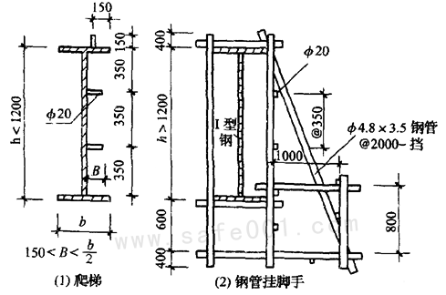 第4.1.11條 登高安裝鋼梁時(shí),應(yīng)視鋼梁高度,在兩端設(shè)置掛梯或搭設(shè)鋼管腳手架,構(gòu)造形式參見附錄四附圖4.3.