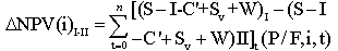 式中(S-I-C'+Sv+W)I ——為投資大的方案的凈現(xiàn)金流量(S-I-C'+Sv+W)Ⅱ——為投資小的方案的凈現(xiàn)金流量 |