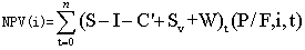 各方案的凈現(xiàn)值比較NPV(i) | 式中 S——年銷售收入I——年全部投資(包括固定資產(chǎn)投資和流動資金) C'——年經(jīng)營費用 Sv——計算期末回收固定資產(chǎn)余值 W——計算期束回收流動資金 i——要求達(dá)到的折現(xiàn)率。財務(wù)分析時,用行業(yè)基準(zhǔn)收益率或業(yè)主期望的收益率;國民經(jīng)濟(jì)分析時,用社會折現(xiàn)率 (P/F,i,t)——第t年的現(xiàn)值系數(shù)。 |