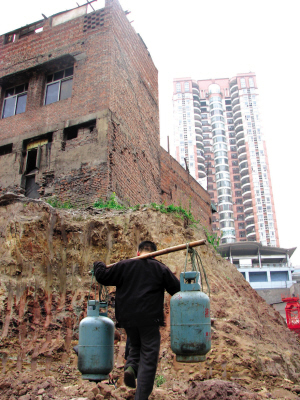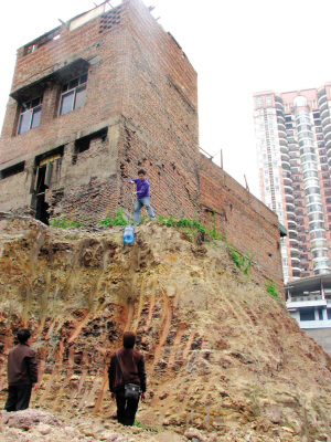 工地的四面全是高樓大廈,中間一個(gè)偌大的坑里,十多米的兩層破敗小樓房孤零零豎立著,這樣的場(chǎng)景在現(xiàn)代化的都市里確算一個(gè)“奇觀”。今年3月初,這樣場(chǎng)景的照片開(kāi)始在各大網(wǎng)站論壇里流傳,因畫(huà)面沖擊力強(qiáng),引起社會(huì)廣泛關(guān)注,戶主也因此得名“最牛的釘子戶”。