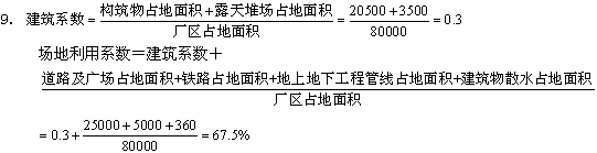 9.某項目廠區(qū)占地面積80000平方米,其中,建(構(gòu))筑物占地面積20500平方米,露天堆場占地面積3500平方米,道路及廣場占地面積25000平方米,綠化面積30000平方米,地上地下工程管線占地面積5000平方米,建筑物散水占地面積360平方米。該項目沒有專用鐵路。經(jīng)計算,該項目的場地利用系數(shù)為( )。