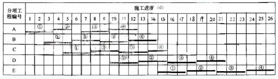 ?。?)解:本工程流水步距為K=3d,流水工期為TP=(5+4-1)×3-2+4=26d,其流水施