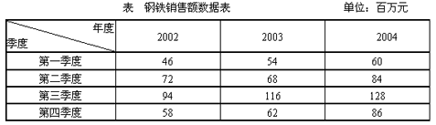一家咨詢公司受某鋼鐵廠委托,為其所在地區(qū)的鋼鐵消費市場進行分析和預(yù)測,為了收集數(shù)據(jù),咨詢公司分別走訪了鋼鐵工業(yè)協(xié)會、鋼鐵研究院和省、市統(tǒng)汁局等相關(guān)部門,并收集到了該地區(qū)2002-2004年的鋼鐵銷售額數(shù)據(jù)。如表所示: