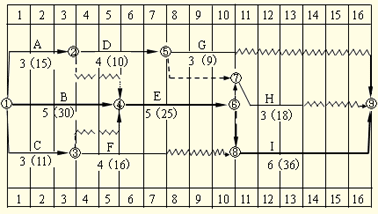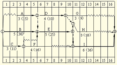 某工程項目業(yè)主通過工程量清單招標確定某承包商為該項目中標人,并簽訂了工程合同,工期為16天。該承包商編制的初始網(wǎng)絡進度計劃(每天按一個工作班安排作業(yè))如圖6-1所示,圖中箭線上方字母為工作名稱,箭線下方括號外數(shù)字為持續(xù)時間,括號內(nèi)數(shù)字為總用工日數(shù)(人工工資標準均為45.00元/工日,窩工補償標準均為30.00元/工日)。由于施工工藝和組織的要求,工作A、D、H需使用同一臺施工機械(該種施工機械運轉臺班費800元/臺班,閑置臺班費550元/臺班),工作B、E、I需使用同一臺施工機械(該種施工機械運轉臺班費600元/臺班,閑置臺班費400元/臺班),工作C、E需由同一班組工人完成作業(yè),為此,該計劃需做出相應的調(diào)整。