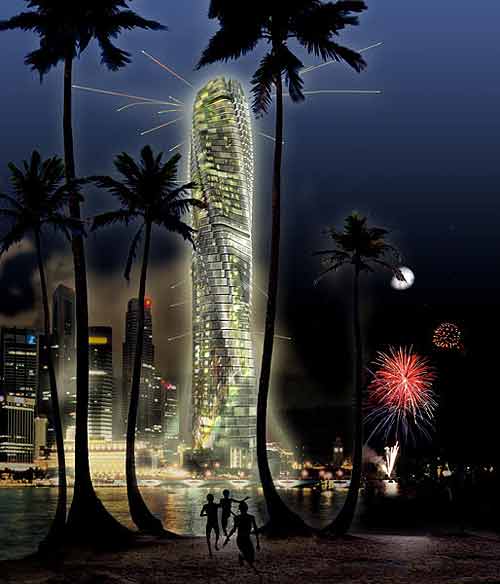 據稱,旋轉摩天大樓倡導綠色環(huán)保觀念,所用電能都是風力渦輪發(fā)電,此外,部分摩天大樓設計圖還在大樓上建造公園,種植許多植物。