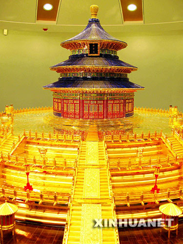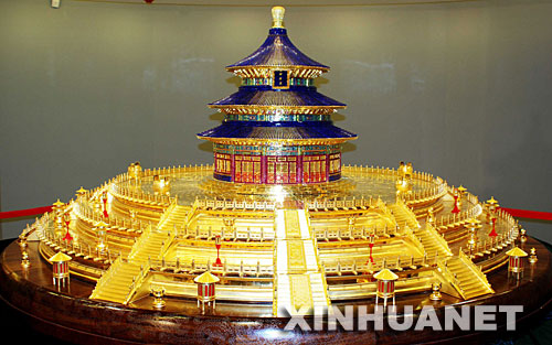 近日,在廣州番禺舉行的中國(guó)工藝美術(shù)大師精品匯展上,一件鑲有約20萬粒寶石的“天壇祈年殿”工藝品引人注目。這件作品高1.38米,重2.5噸,以金銀、寶石等材料制成。