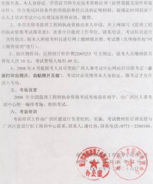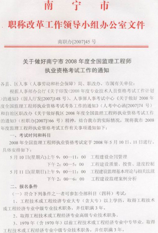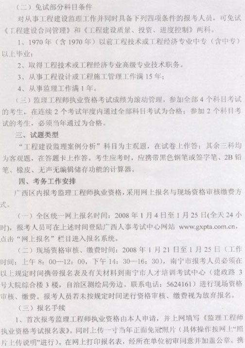 [南寧]2008年度全國監(jiān)理工程師執(zhí)業(yè)資格考試08年1月4日至25日報名