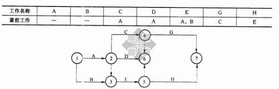 3、根據(jù)下表給定的邏輯關(guān)系繪制的某分部工程雙代號(hào)網(wǎng)絡(luò)計(jì)劃如下圖所示,根據(jù)雙代號(hào)網(wǎng)絡(luò)計(jì)劃的繪圖規(guī)則,其作圖錯(cuò)誤是( )。